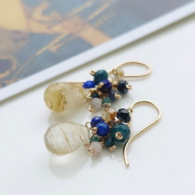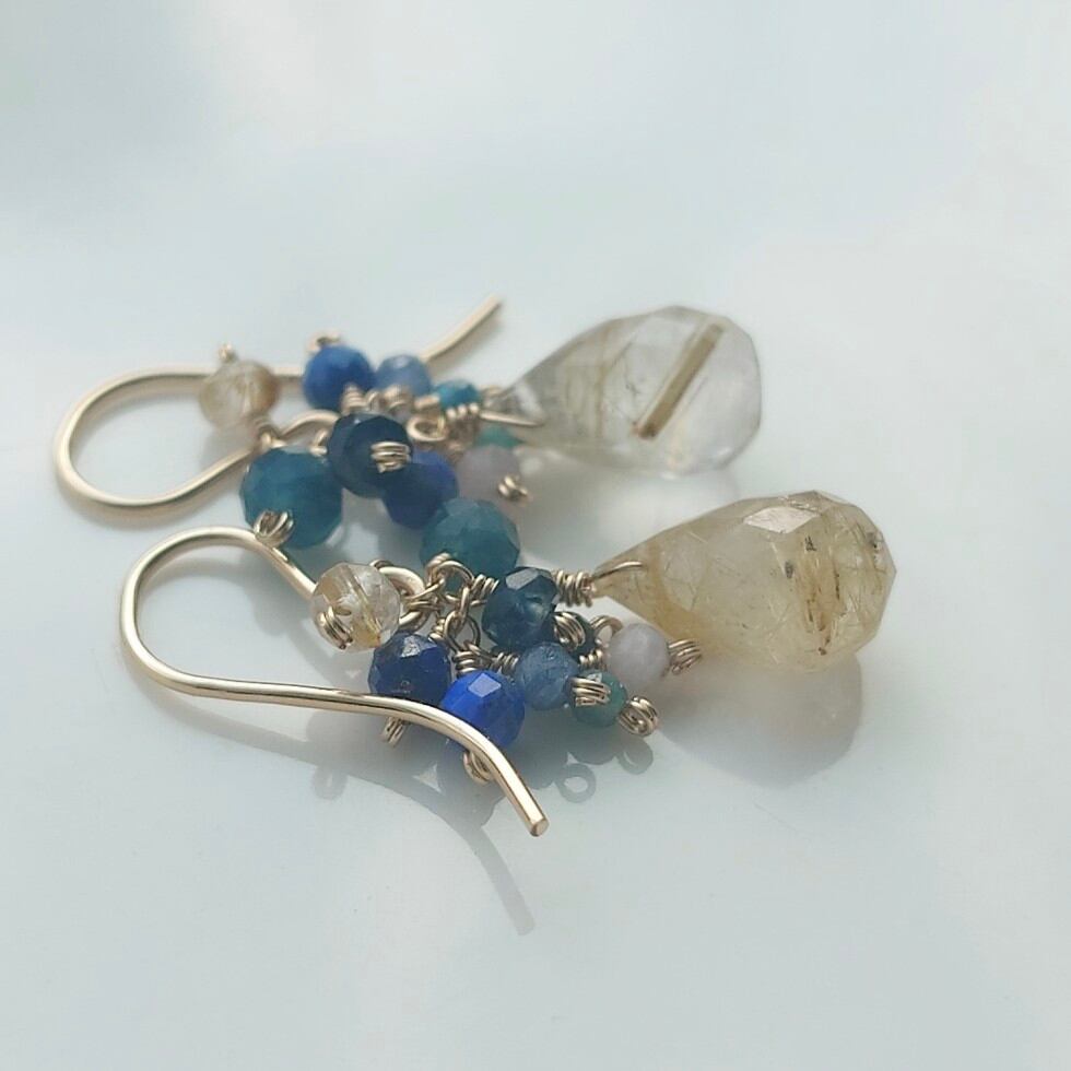 トルマリン、ラピスラズリ、サファイアを重ね、静かに、旋律のように揺れるデザインに仕立てました。