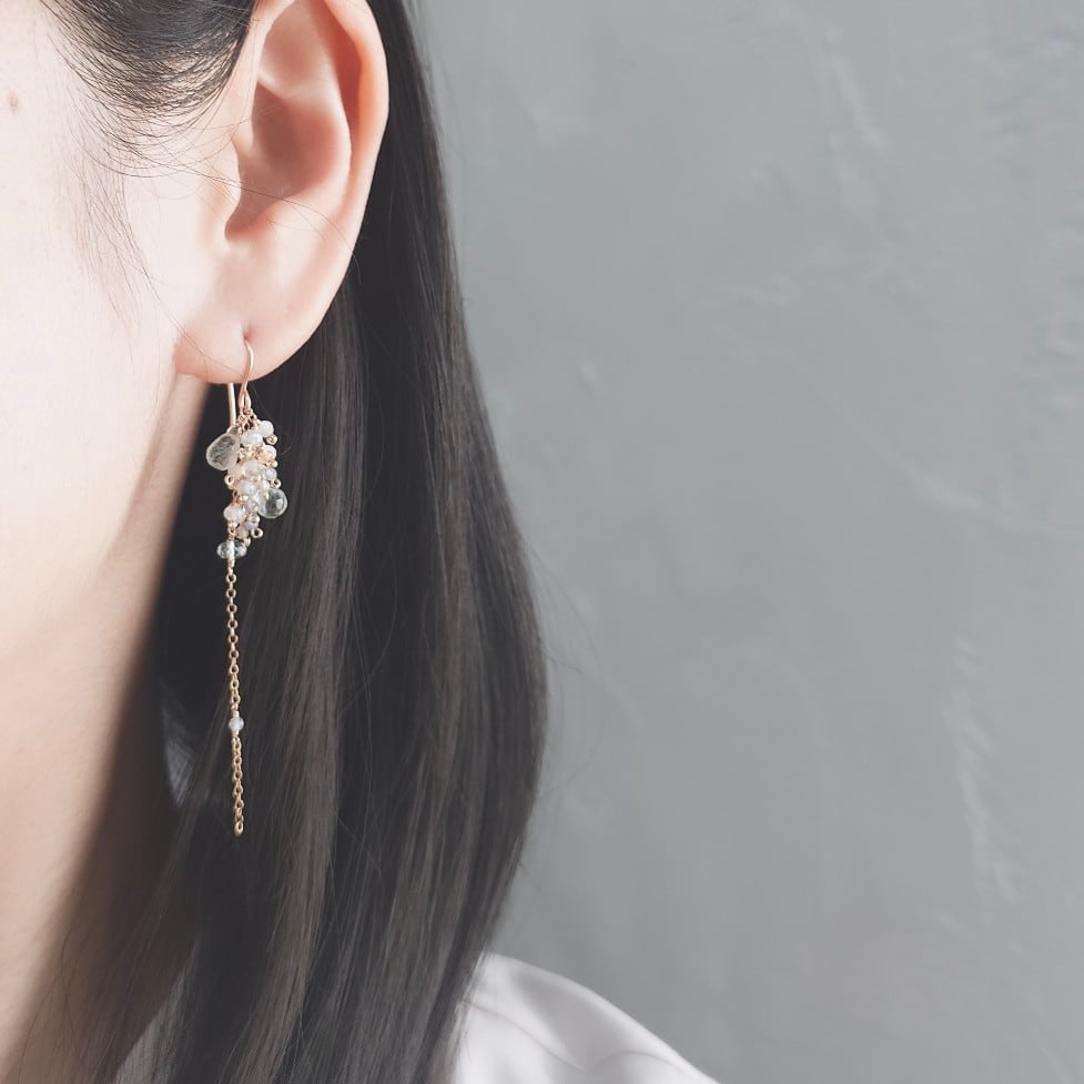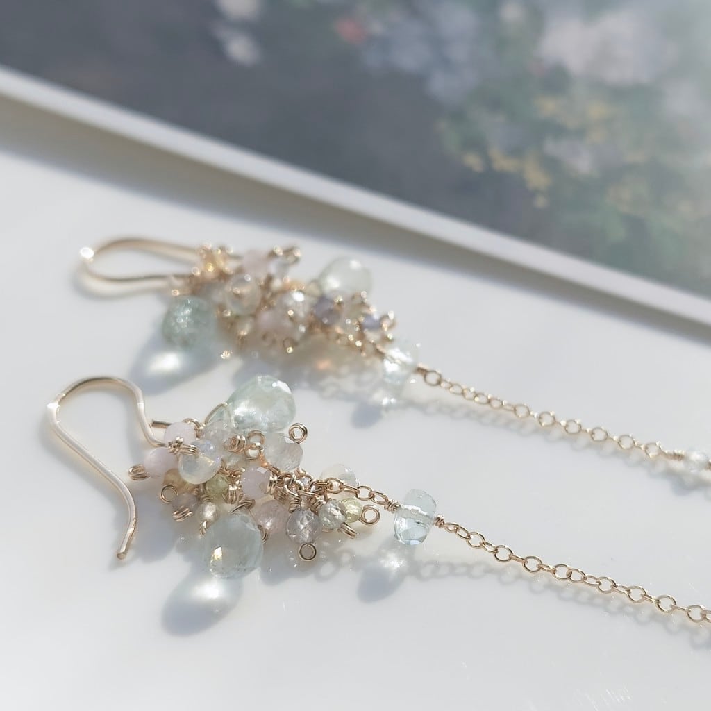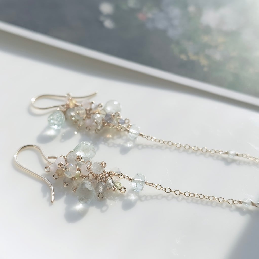 ルノワールの春の花束をモチーフにした、アクアマリンのロングピアス。